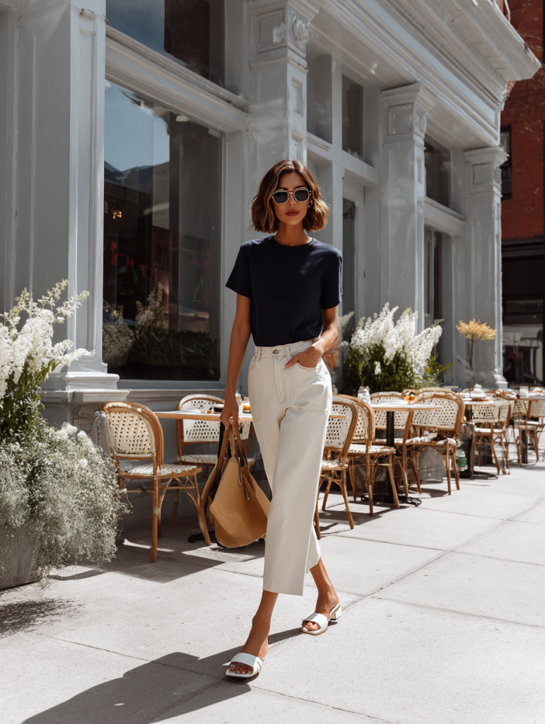 Beige, white, and navy blue are key colors. Adding different textures like cotton and denim makes outfits interesting. Try a linen shirt with denim pants for a cool look.