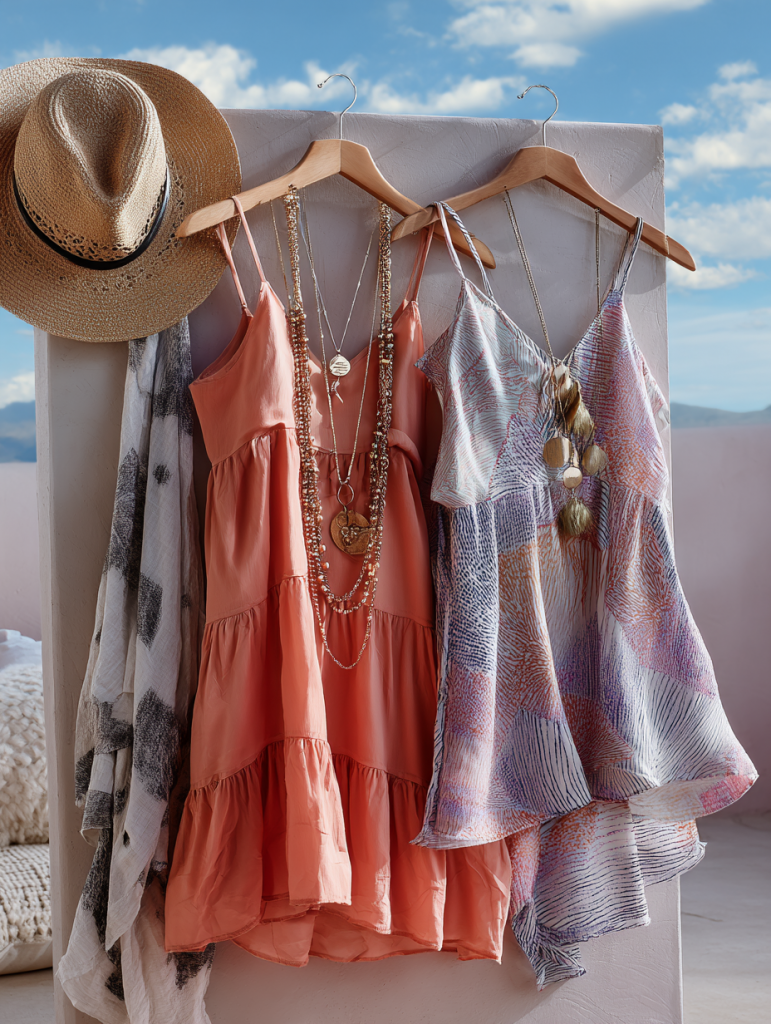 Start with flowy sundresses in bright colors or cool patterns. Add layered necklaces and floppy hats for a bohemian vibe. Wear sandals or espadrilles to stay cool and look good.